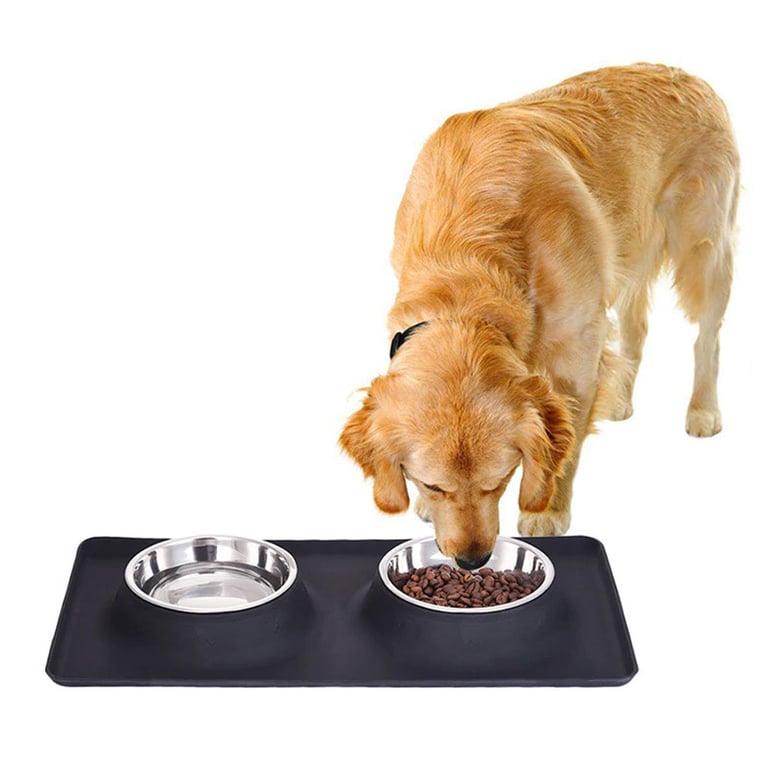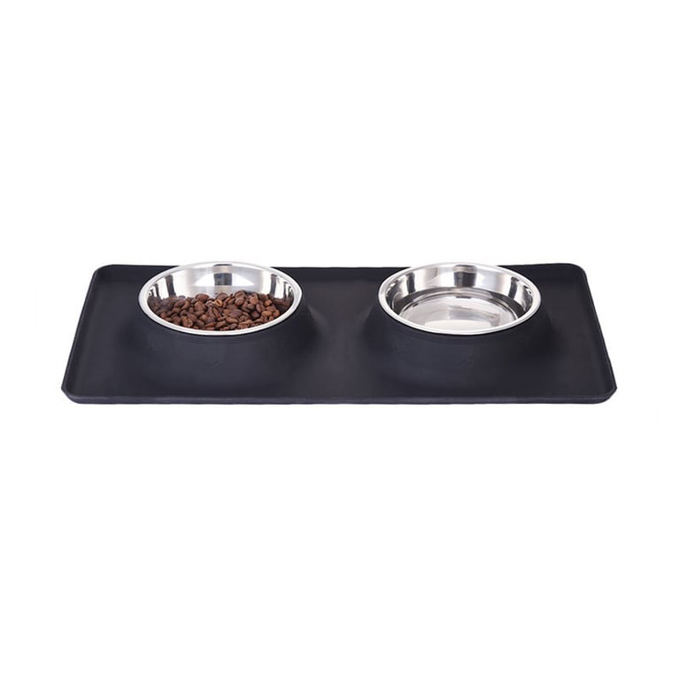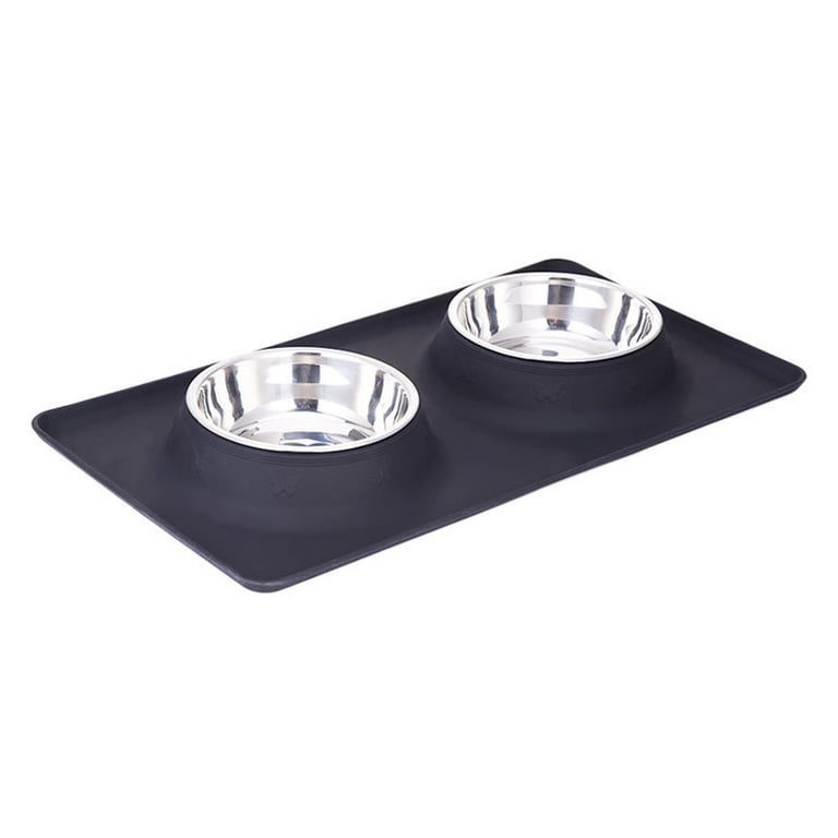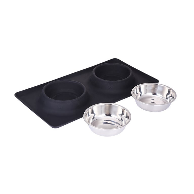 Double bowl for feeding dogs or cats. Designed for kibble, water, or other food. Stainless steel surface. Non-slip silicone mat that catches food or water spills.