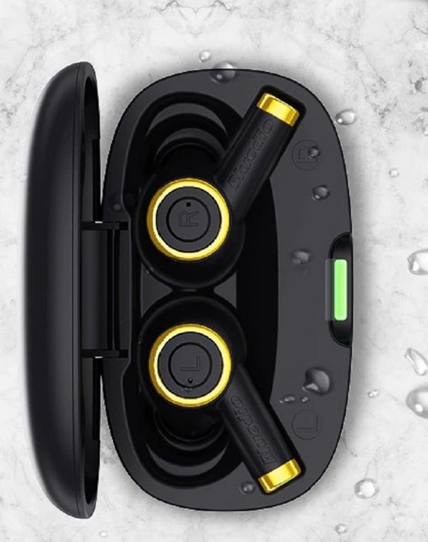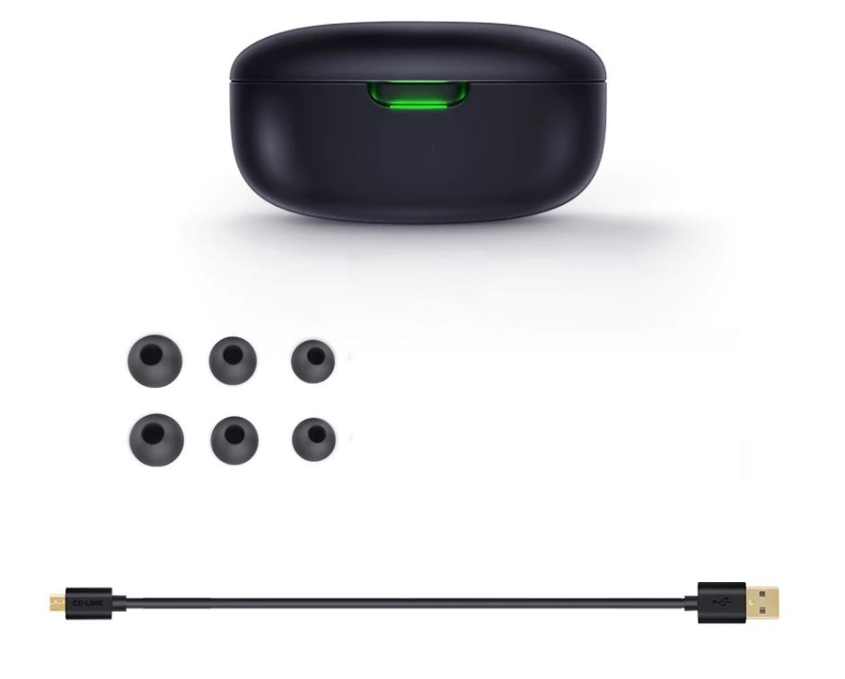 Contents of the package: 2x earphones, 1x case, 6x silicone tips, 1x charging cable