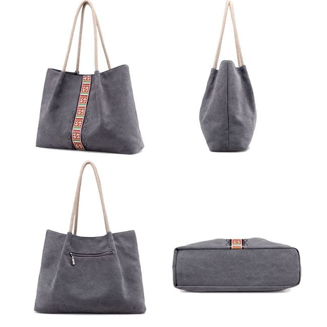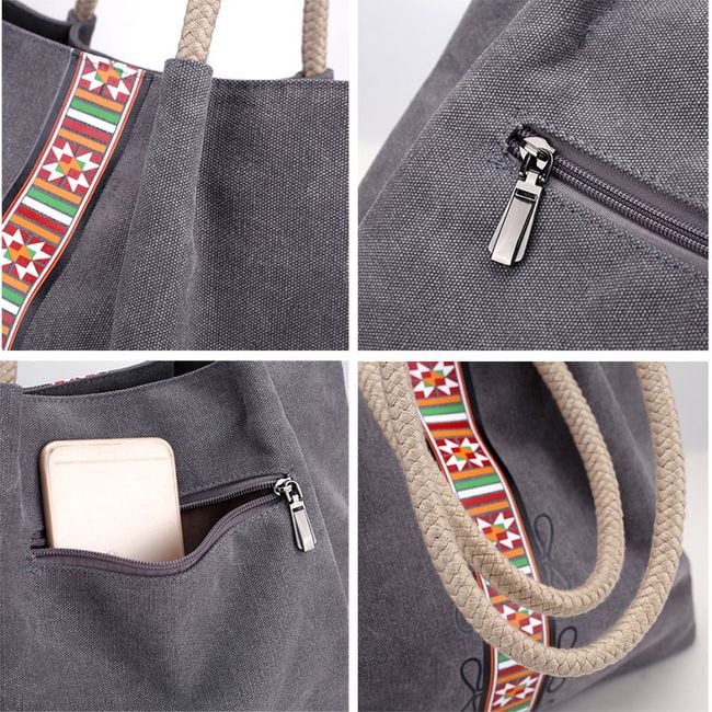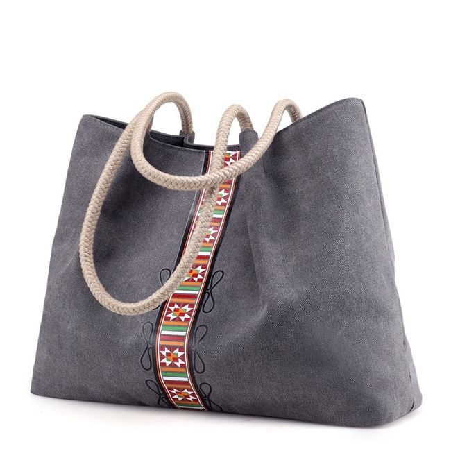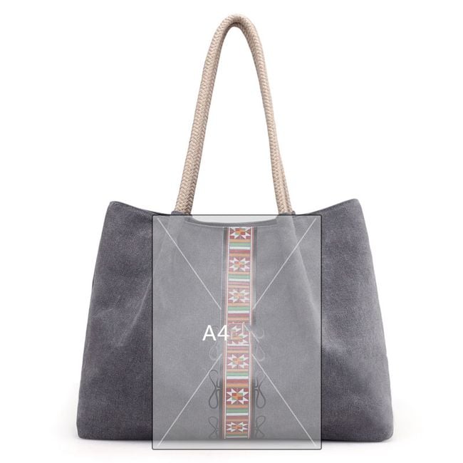 The canvas bag is spacious. The handles are made of rope. It is decorated with a colourful ribbon. It features several internal pockets and one external pocket. You can choose from several colours.