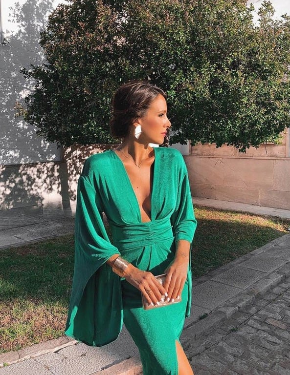 Luxurious bodycon dress with flared sleeves and a deep neckline.