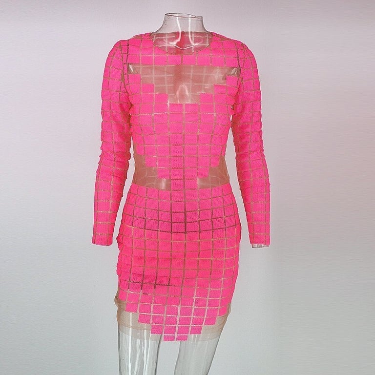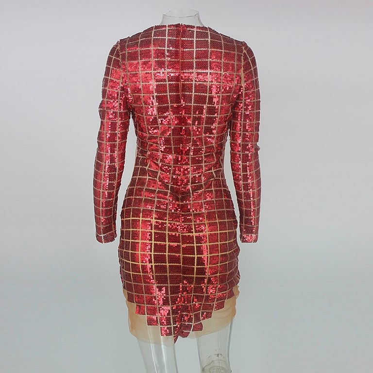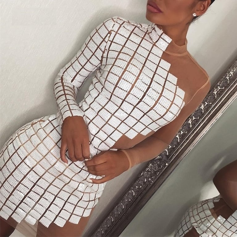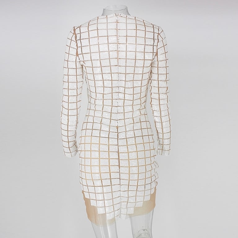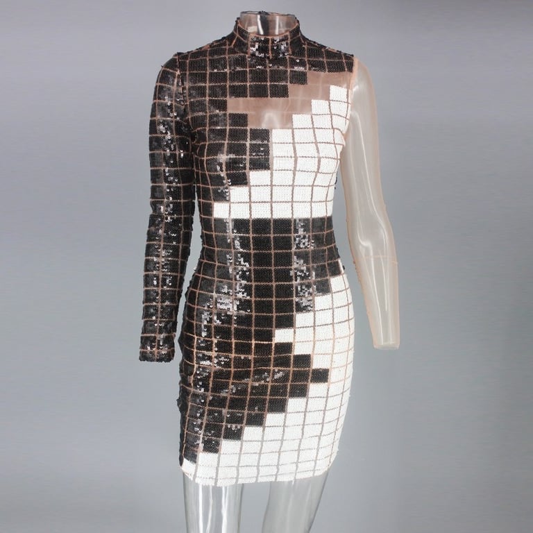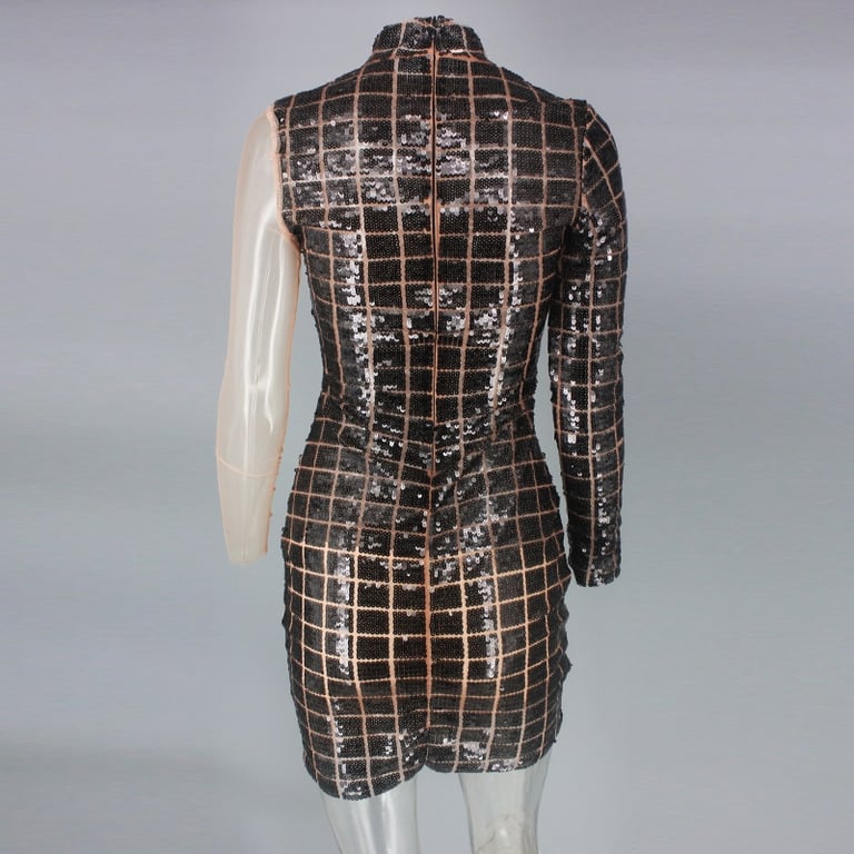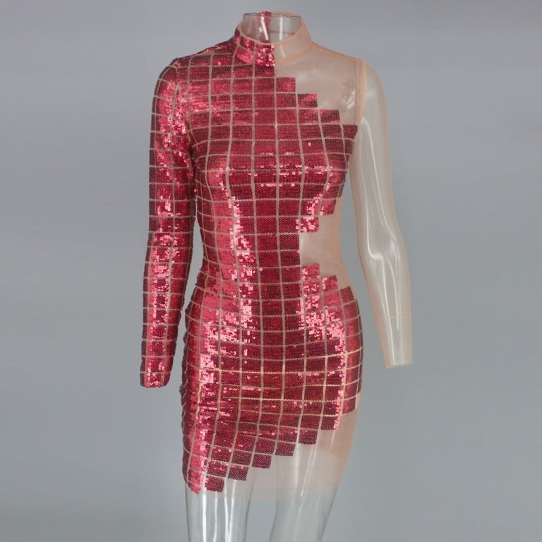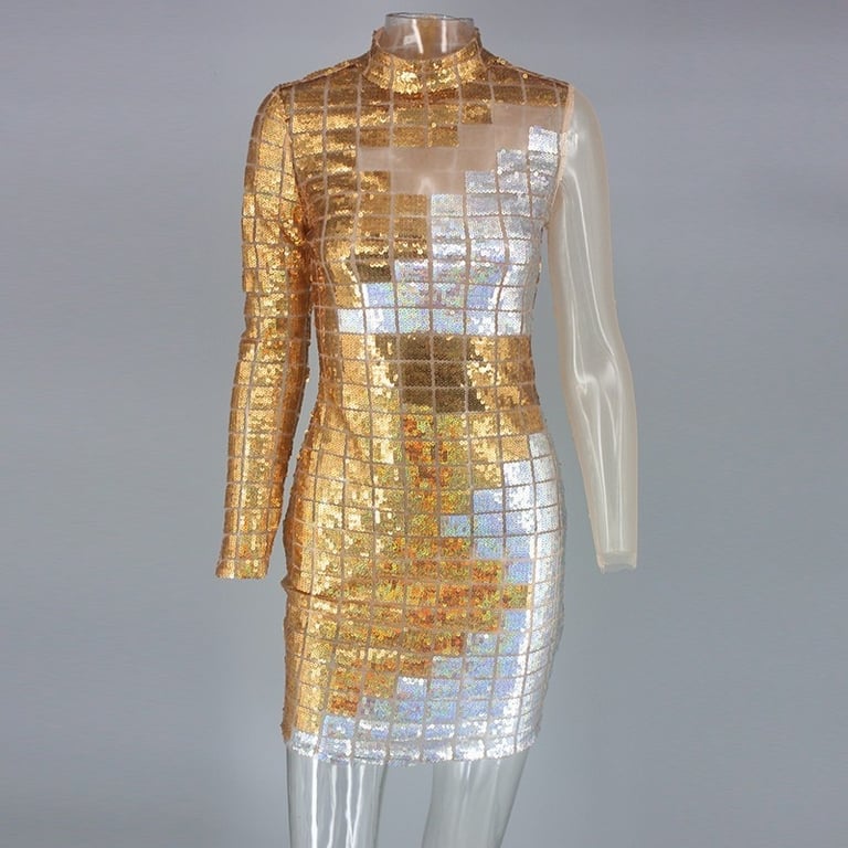 Luxurious mini dress made from sparkly material and sheer mesh.