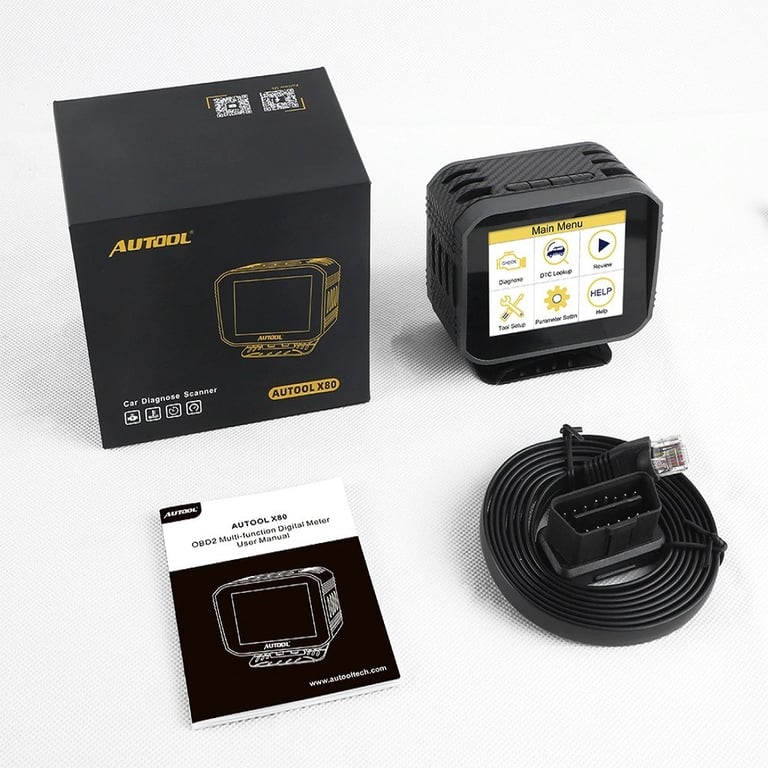 Contents of the package: 1x main unit, 1x OBD cable, 2x adhesive pads, 1x user manual, 1x original box
