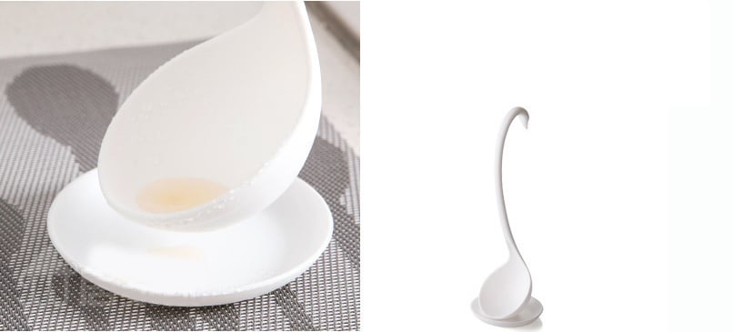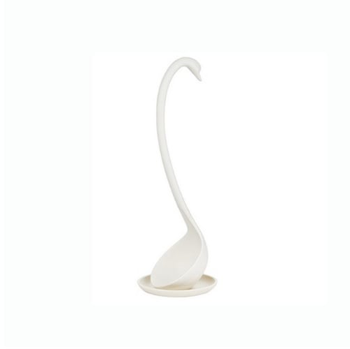 The modern plastic ladle in the shape of a swan is a very practical kitchen tool.
