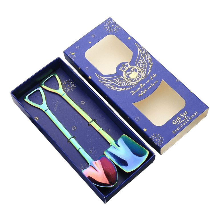 Package contents: 1x shovel shaped spoon, 1x spade shaped spoon, 1x gift box