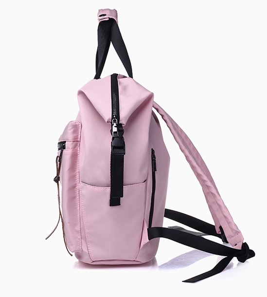 Single-compartment zip backpack. Front zip pocket. Open side pockets.