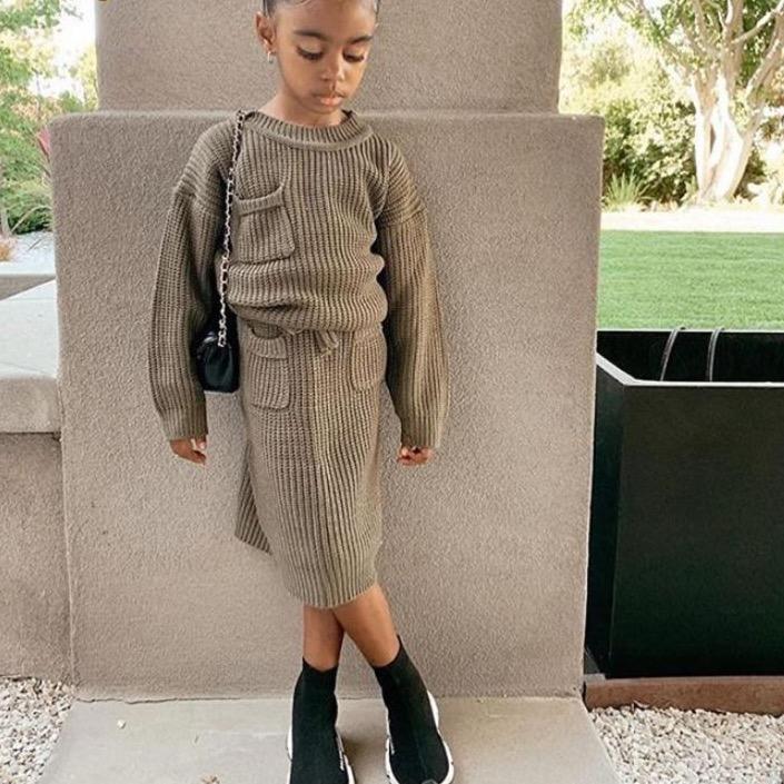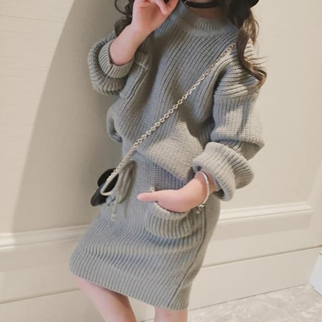 Cotton girls' set. Sweater and knee-length skirt. Available in several colours. Suitable for spring.