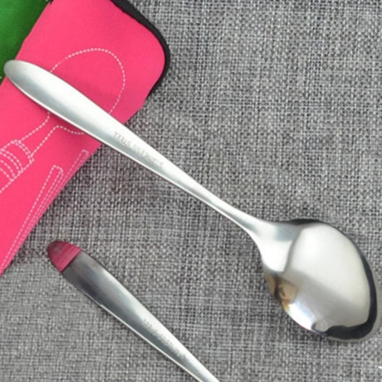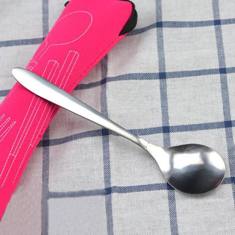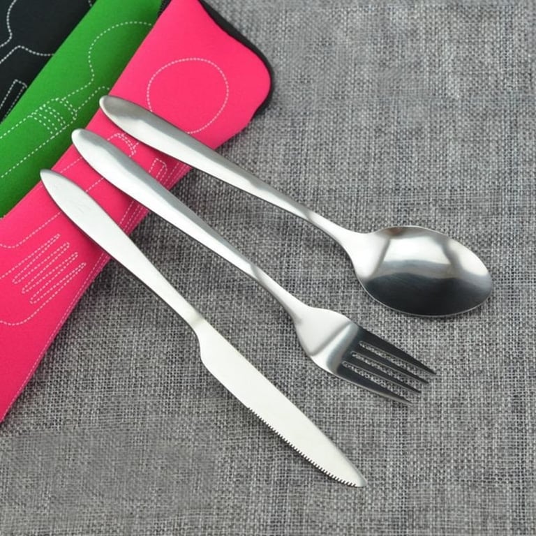 The three-piece stainless steel cutlery set includes a fork, knife, and spoon. The cutlery is stored in a colourful zip case.