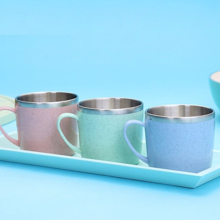 Stainless steel mug with a rim made from processed straw.