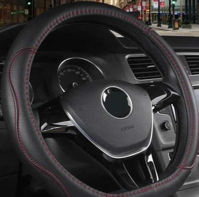 Leather steering wheel cover for Nissan Altima 2025-2025, Nissan Versa 2025. Breathable, in black with black or red stitching.
