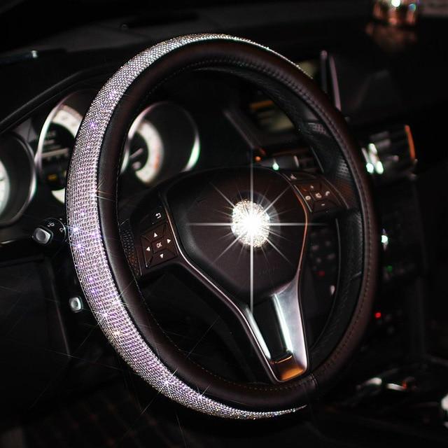 Beautiful steering wheel cover, handbrake cover and gear stick cover with sparkling stones. The diameter of the cover is 38 cm, made of artificial leather. It perfectly complements and decorates the interior of the car.