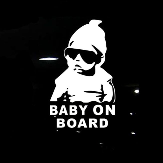 The well-known baby on board sticker is also available in this cool variant – the baby is wearing a cap and sunglasses.