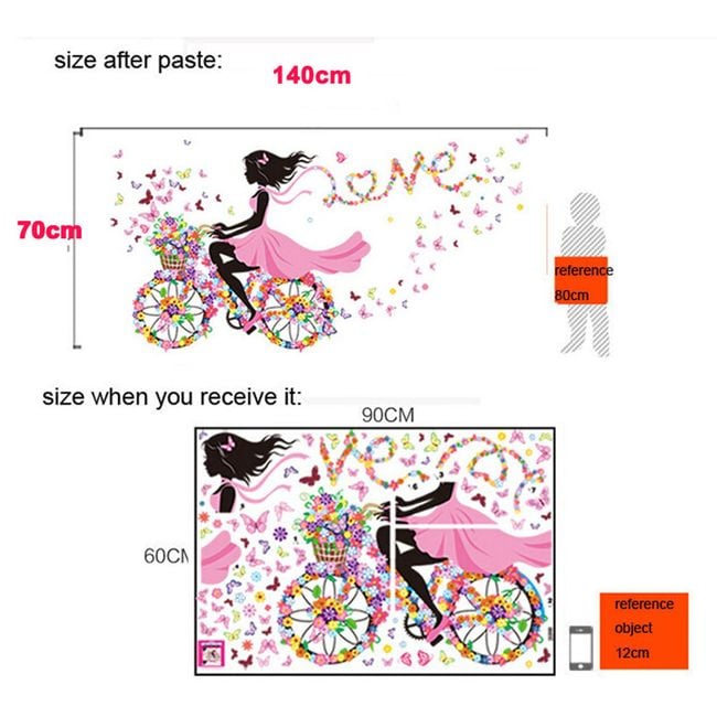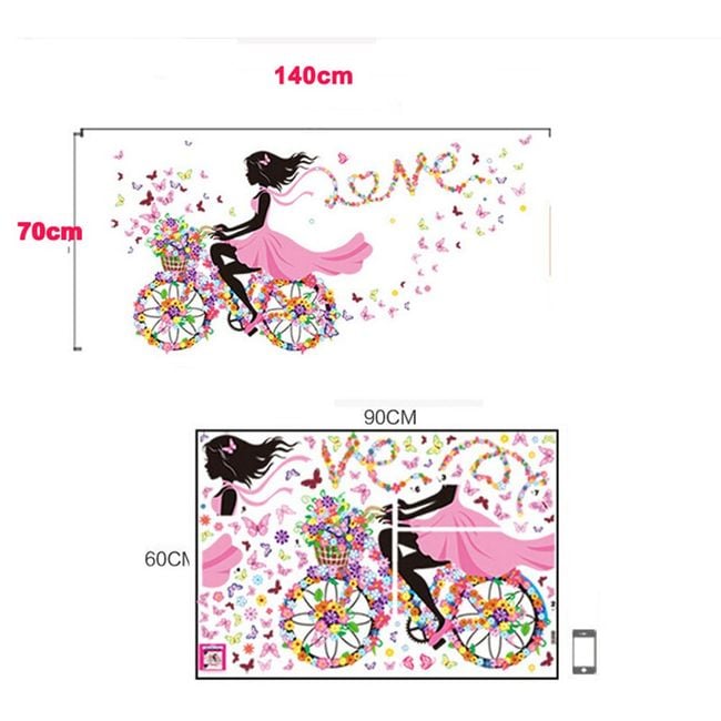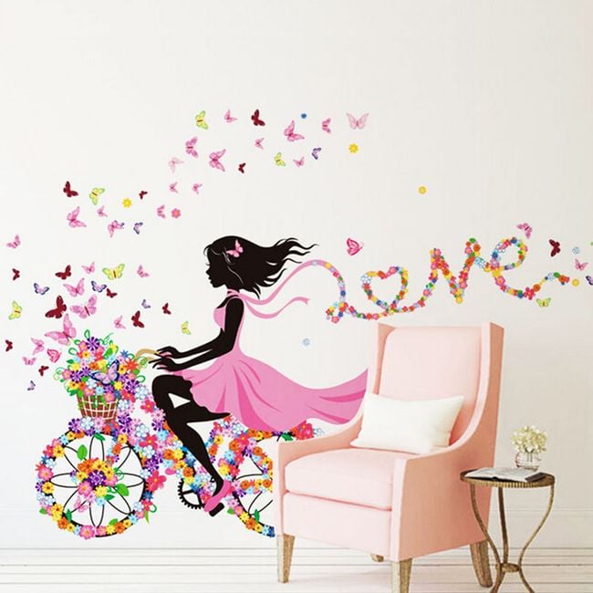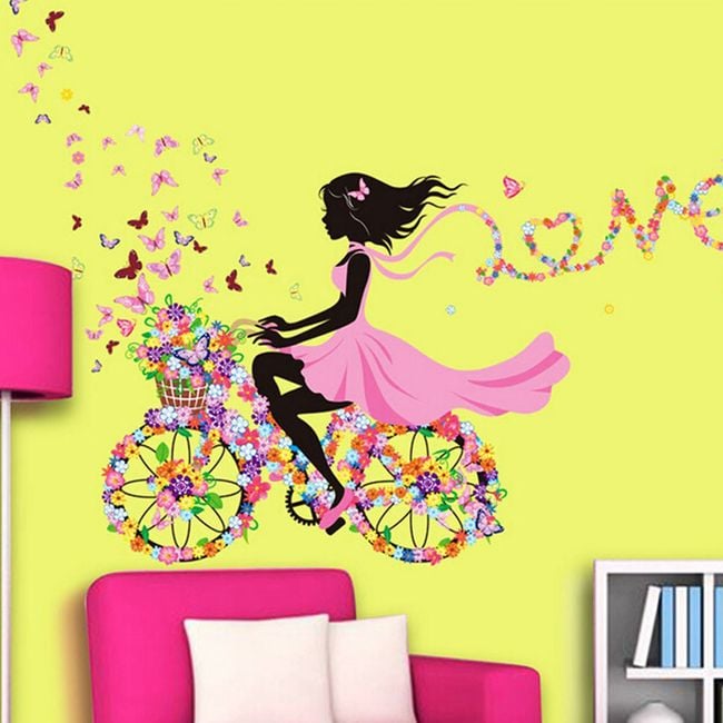 Brighten up a girl's room with this sticker. It features a girl on a floral bicycle surrounded by butterflies.