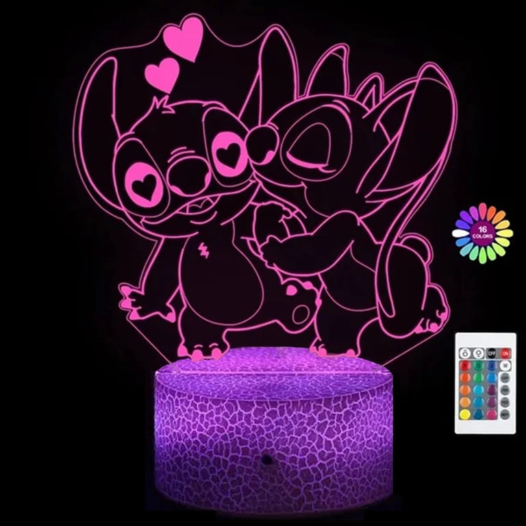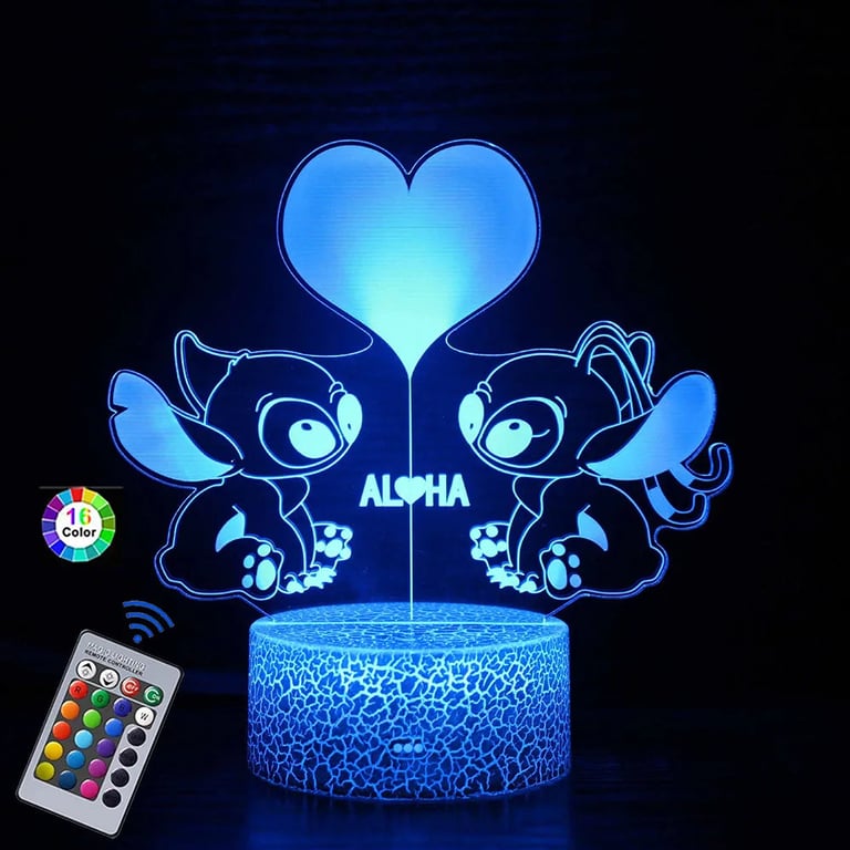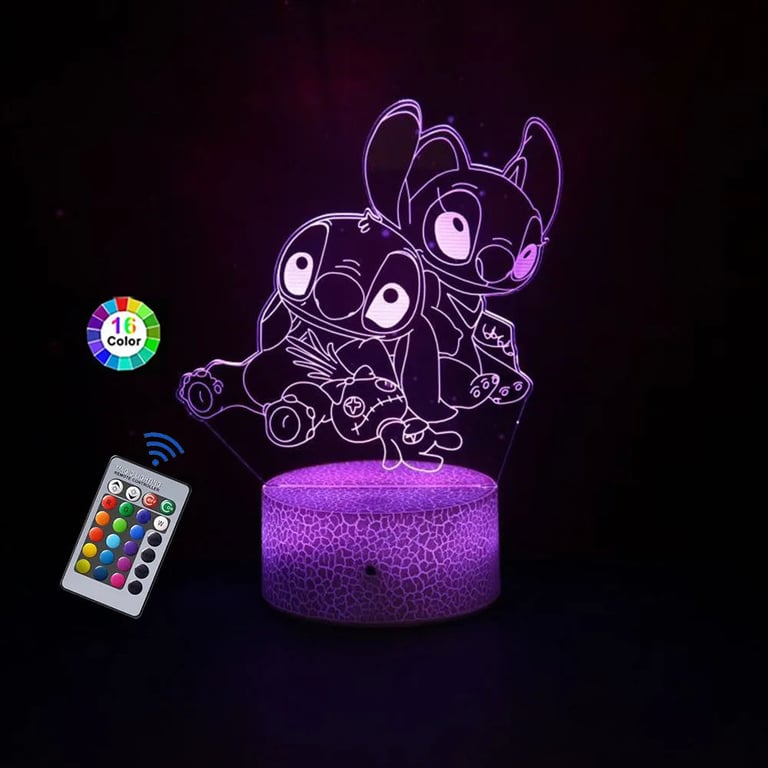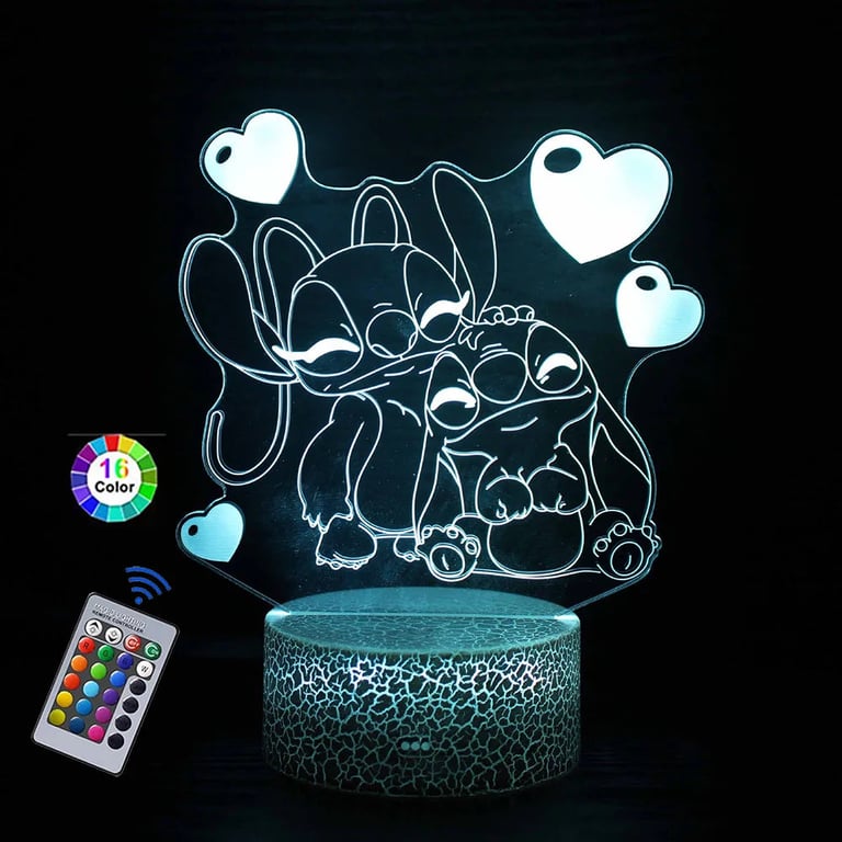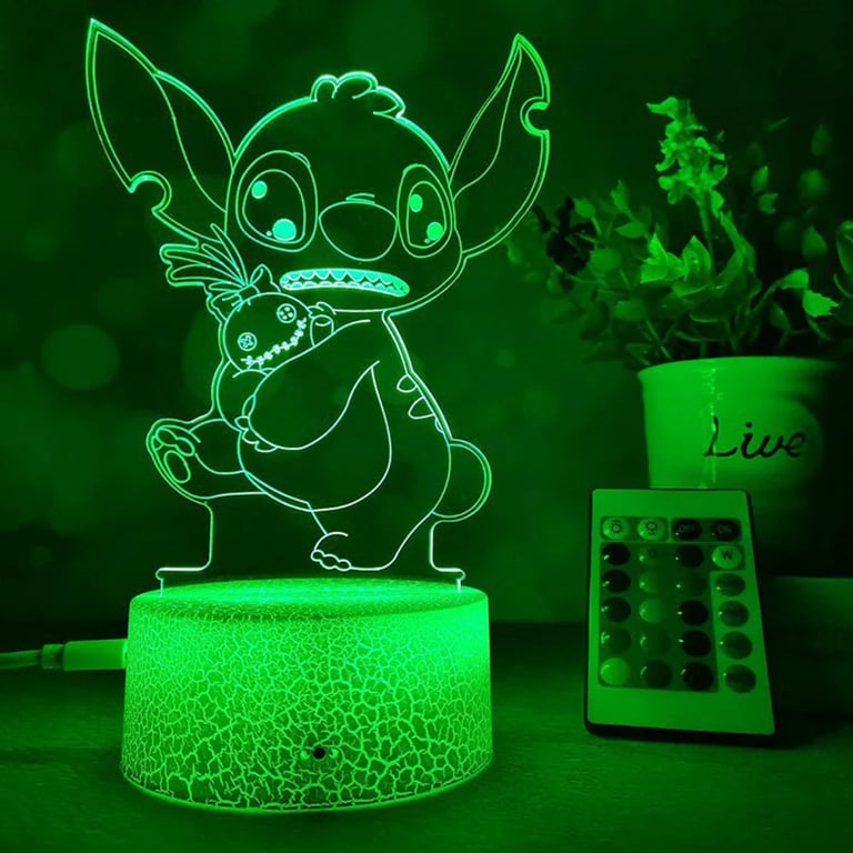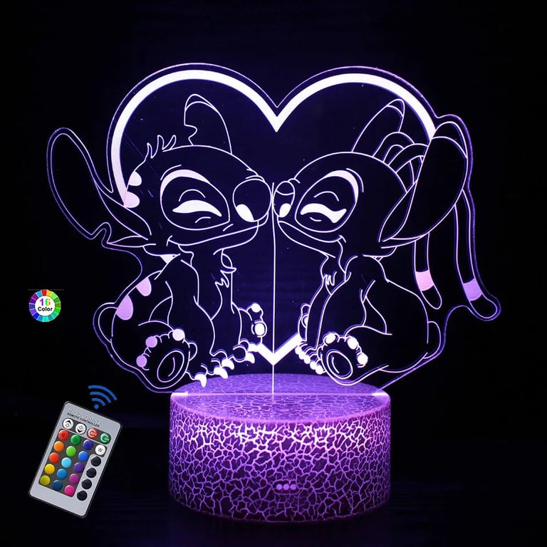 LED night lamp is a cute decoration with an engraved Stitch motif, which can be controlled by touch or remote control. The lamp can emit up to 16 colours, offers various lighting effects and can be powered via USB. The eye-catching acrylic panel with a Stitch drawing beautifully lights up a child's room, a bedroom or a desk.