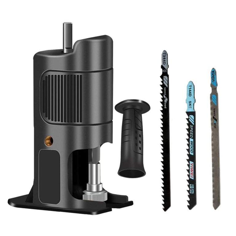 Transform your electric drill into a jigsaw. You don't need to have two different tools. Simply attach the adapter to a standard drill and you can start cutting. The jigsaw head is easily portable and compact. For better and safer handling, you can attach a side handle. The set also includes three replacement saw blades in different lengths.