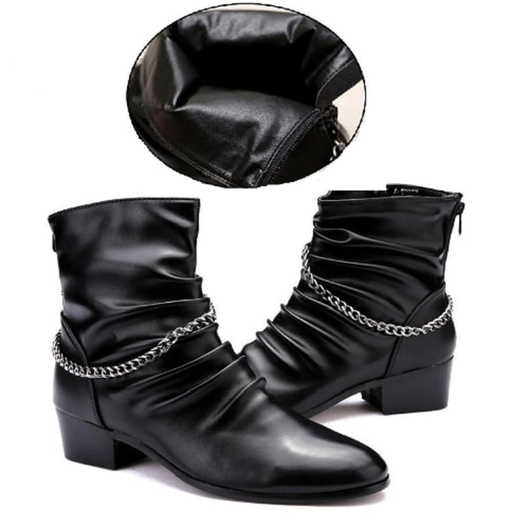 The boots feature a zip fastening and are adorned with a chain.