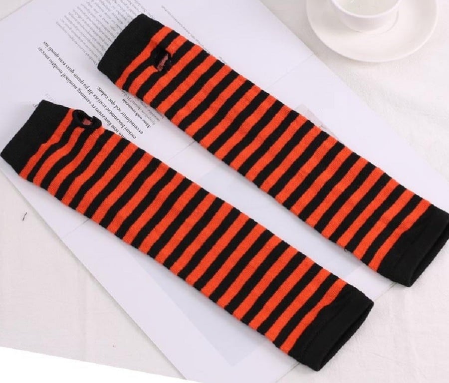 Long striped fingerless gloves.