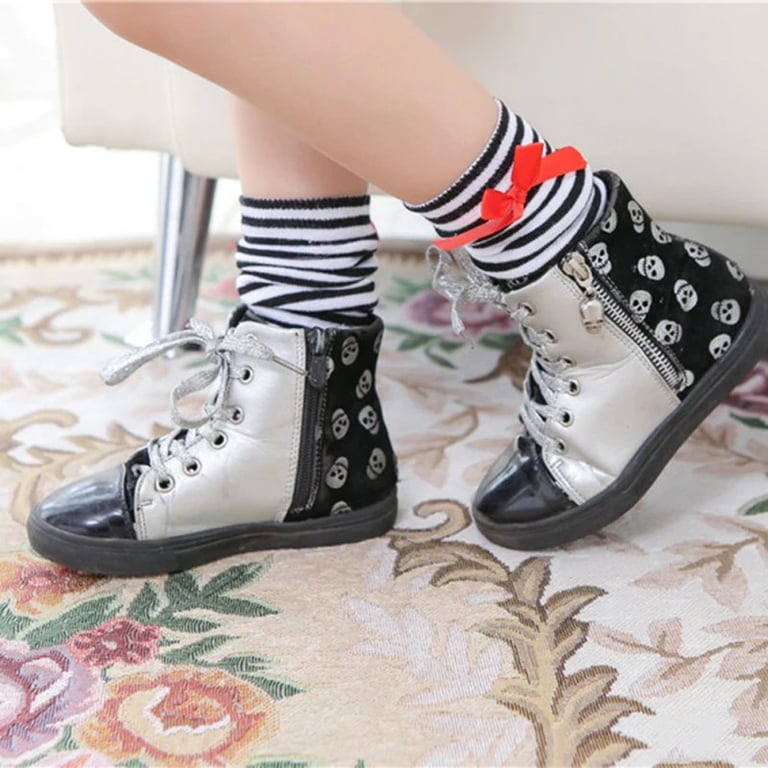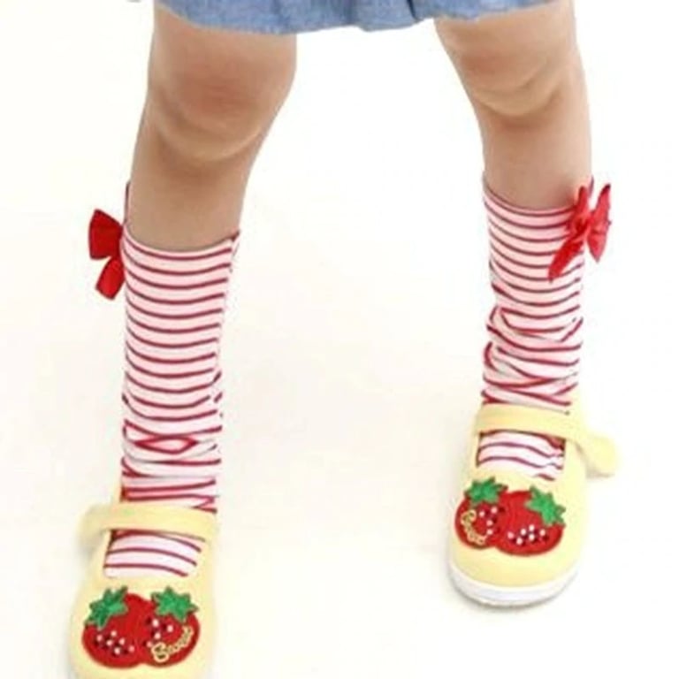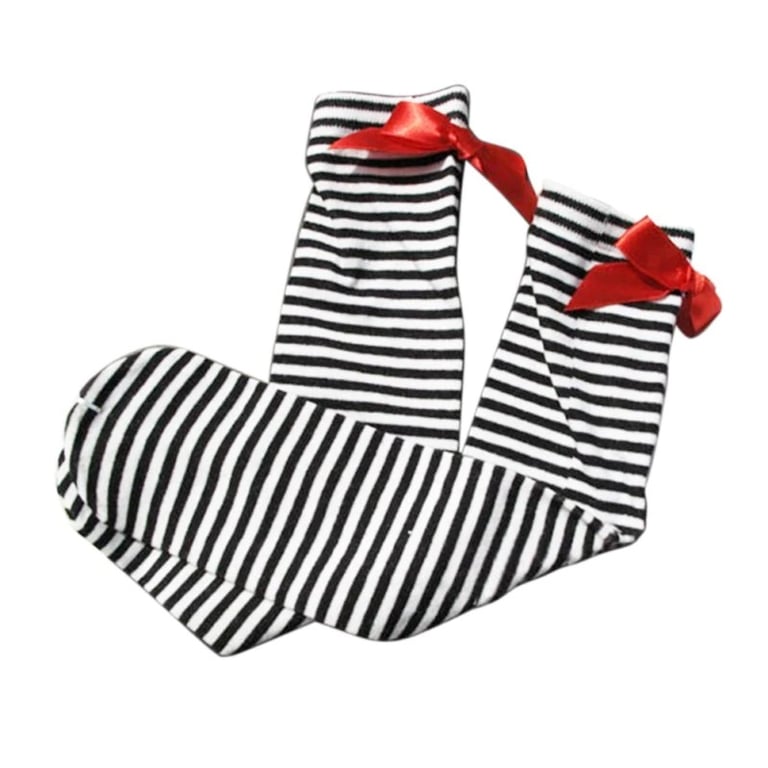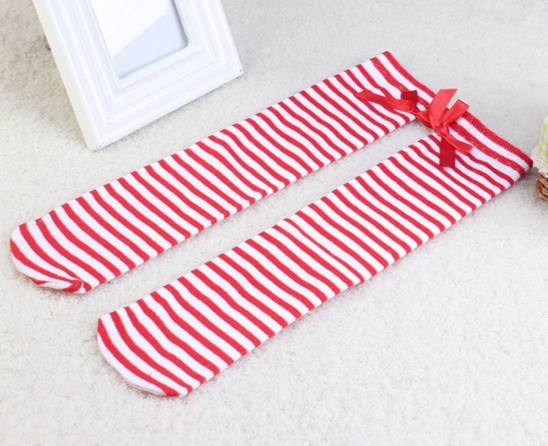 Knee-high socks in a striped design. They are adorned with a small bow.