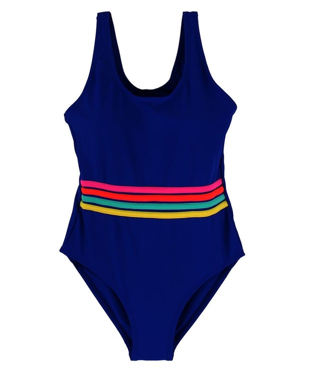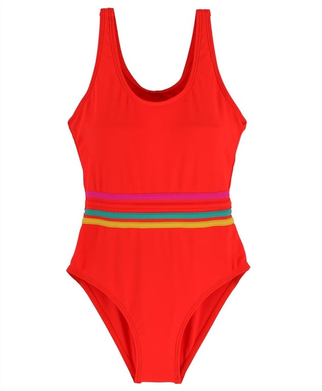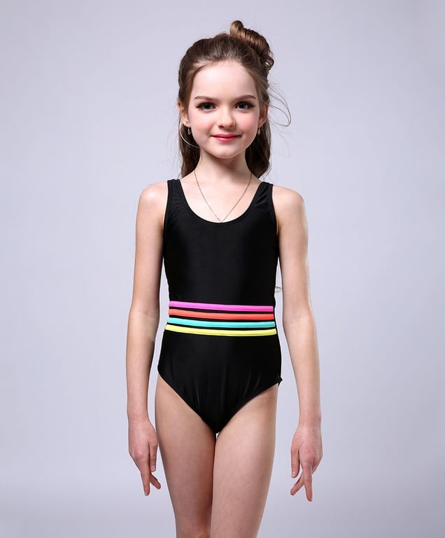 Beautiful girls' swimsuit with a hole in the back and decorative stripes at the waist.