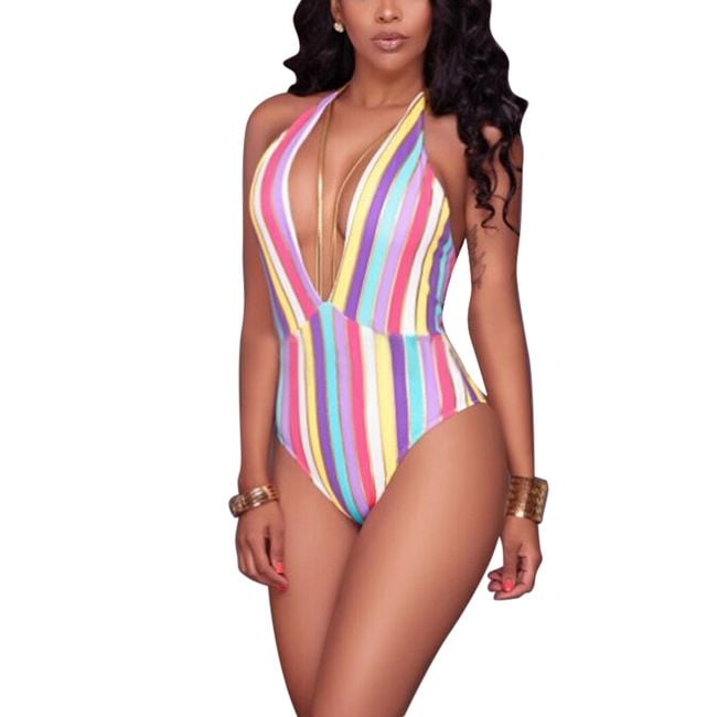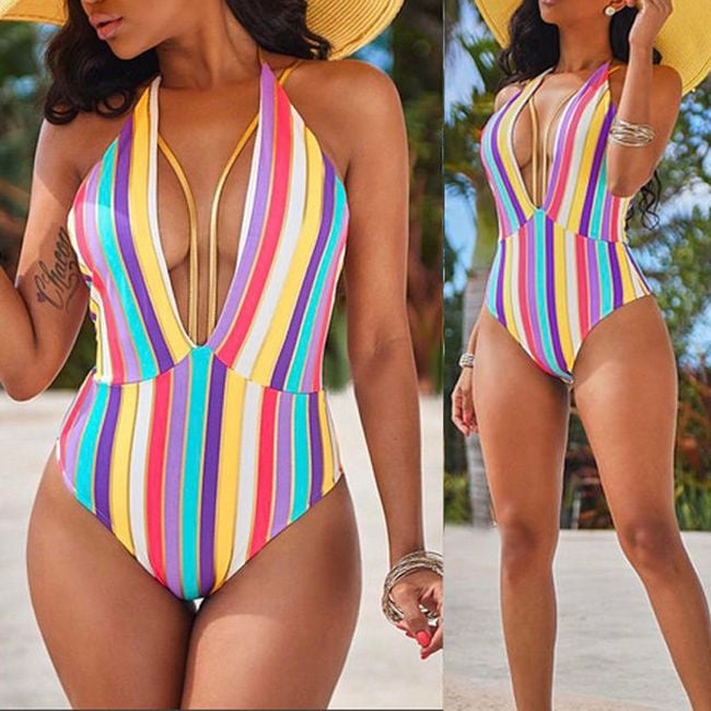 Beautiful quick-drying swimsuit with colourful stripes. Thanks to the deep neckline, you will get a great tan in this one-piece swimsuit. They are comfortable and beautifully tailored.