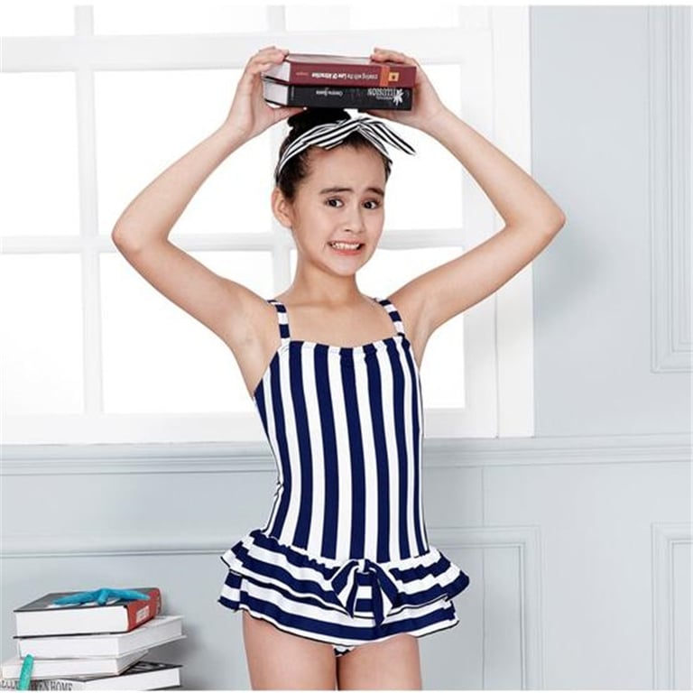 Girls' One-Piece Striped Swimsuit with Skirt for Teenagers