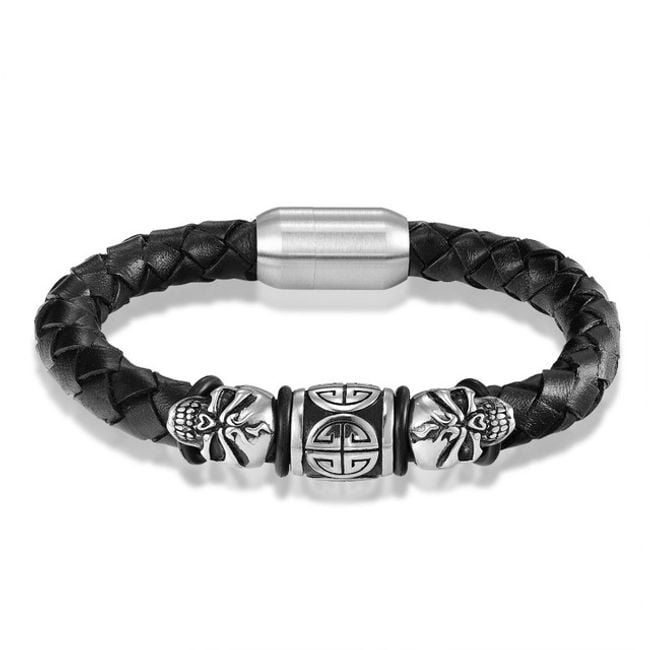 The bracelet is braided, features a skull pendant, and is suitable as an accessory for everyday wear.