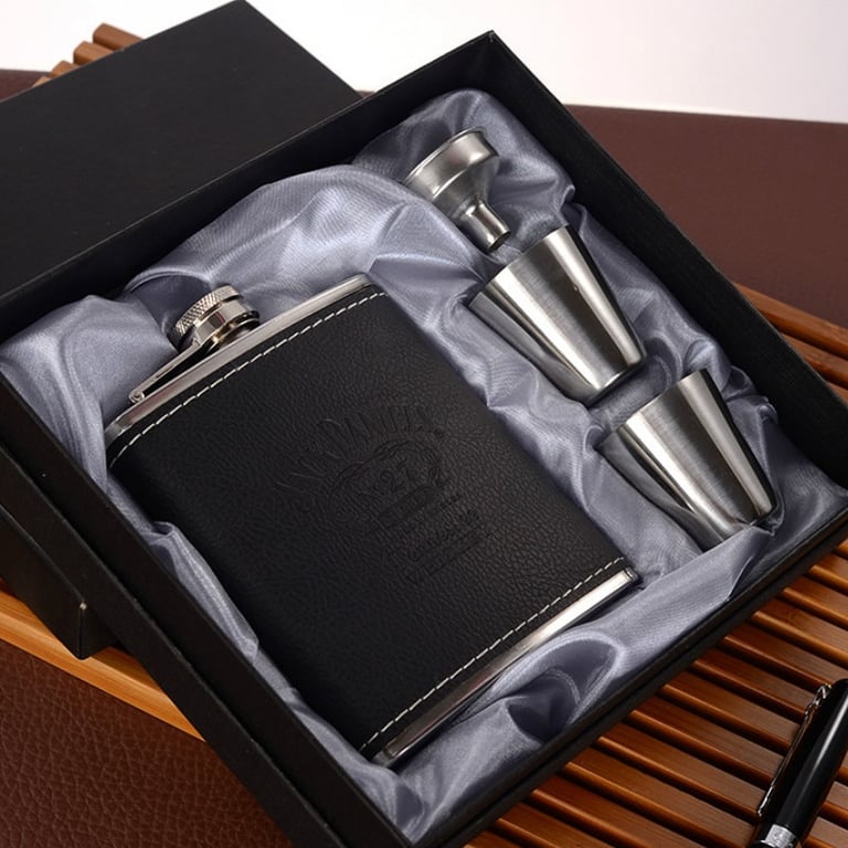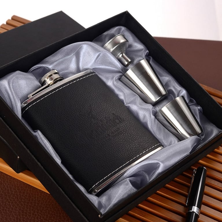 Stylish leather hip flask suitable as a gift for your husband, father, grandfather, or older son.