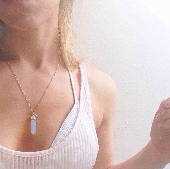 Stylish necklace with a delicate chain features an interesting pendant in the shape of an artificial crystal.