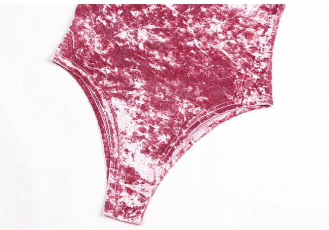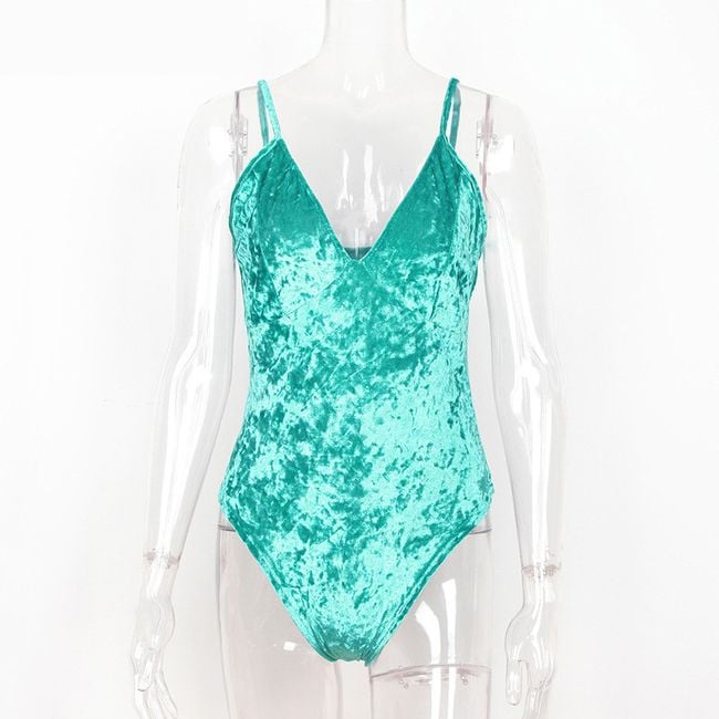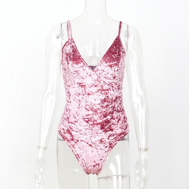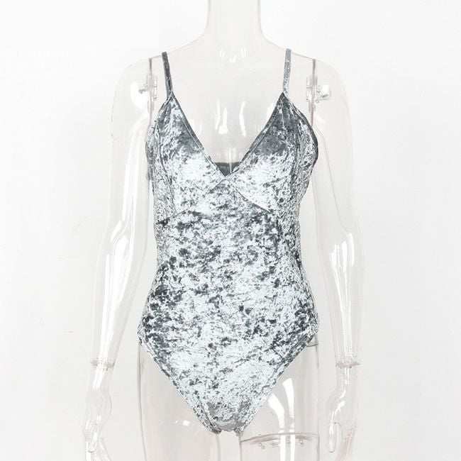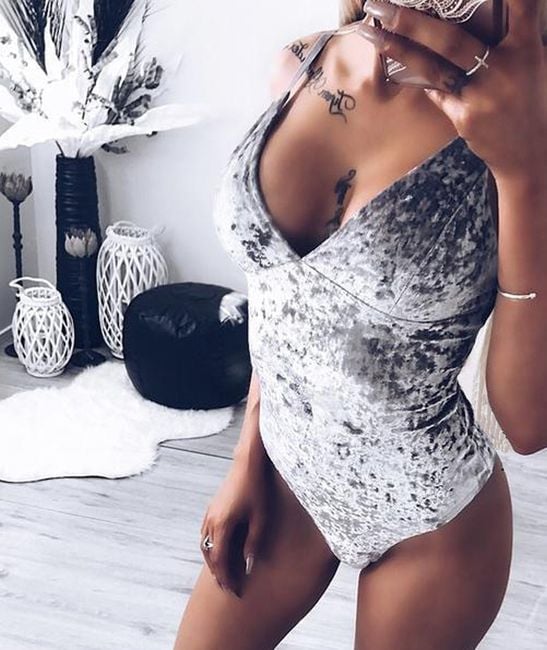 The bodysuit has a seductive neckline and narrow straps.