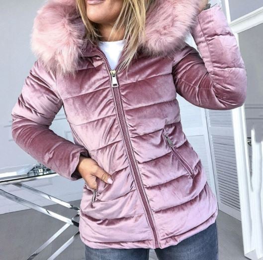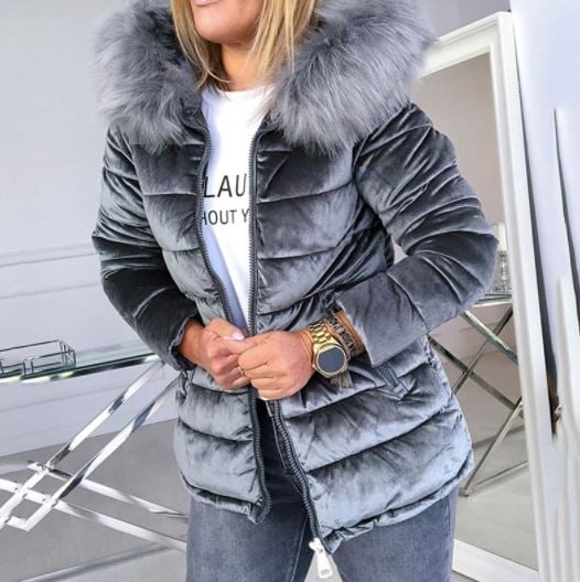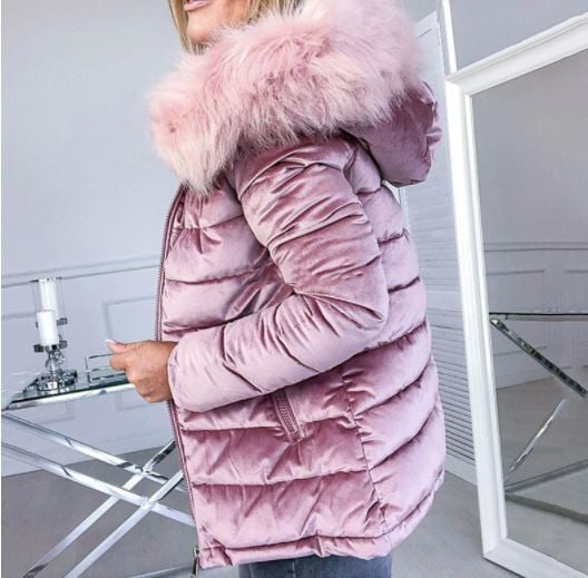 Suede quilted warm women's winter jacket with fur.