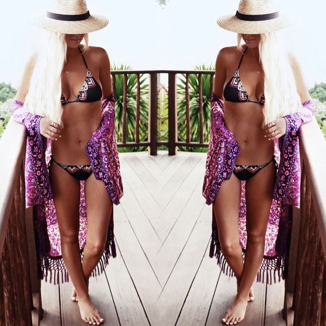 The cover-up has a fringed hem and is ideal for the beach.