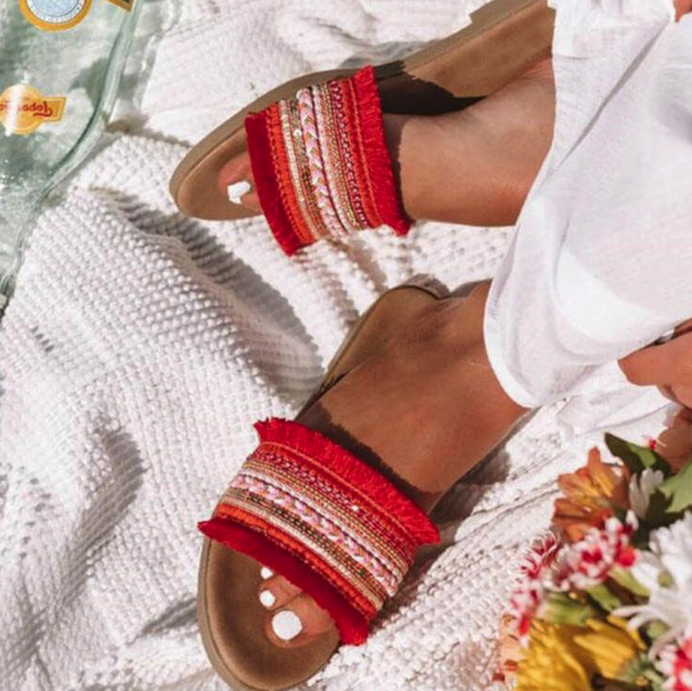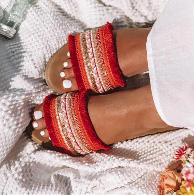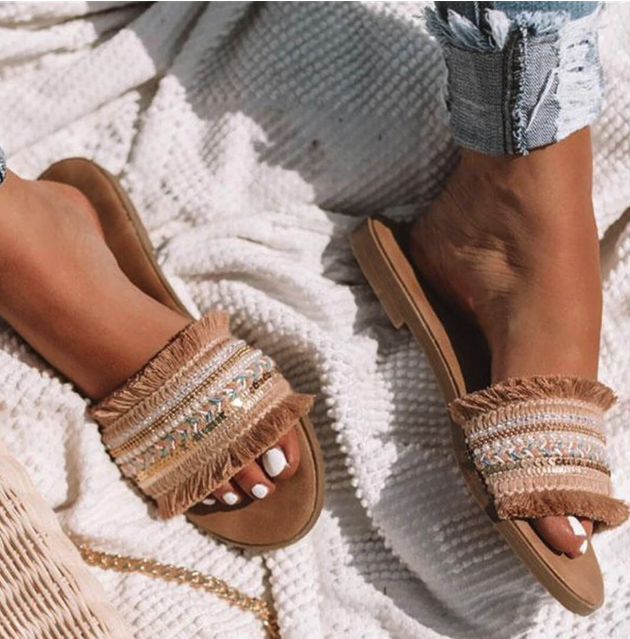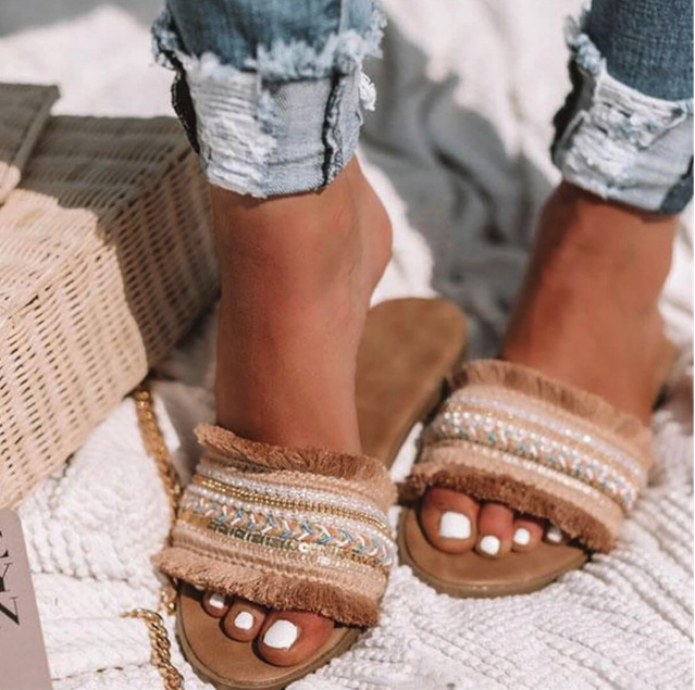 Summer beach fabric women's slippers with rhinestones