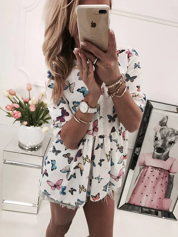 Women's summer dress with a butterfly print. There are two options to choose from. The first option is a white dress with a subtle round neckline and cut-out back, connected by a light chain. It features a butterfly print on the back. The second option is a tunic-style dress, fitted at the waist and flowing freely from the waist down with ruffles.