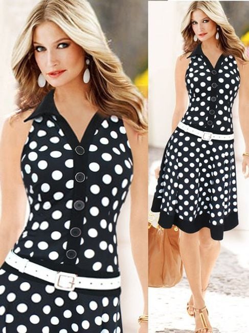 Great vintage dress ideal for warm summer days. The sleeveless dress features a small collar and a V-neck. You have the option to choose a dress in predominantly black or white.
