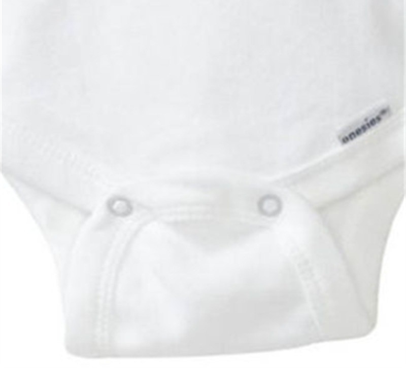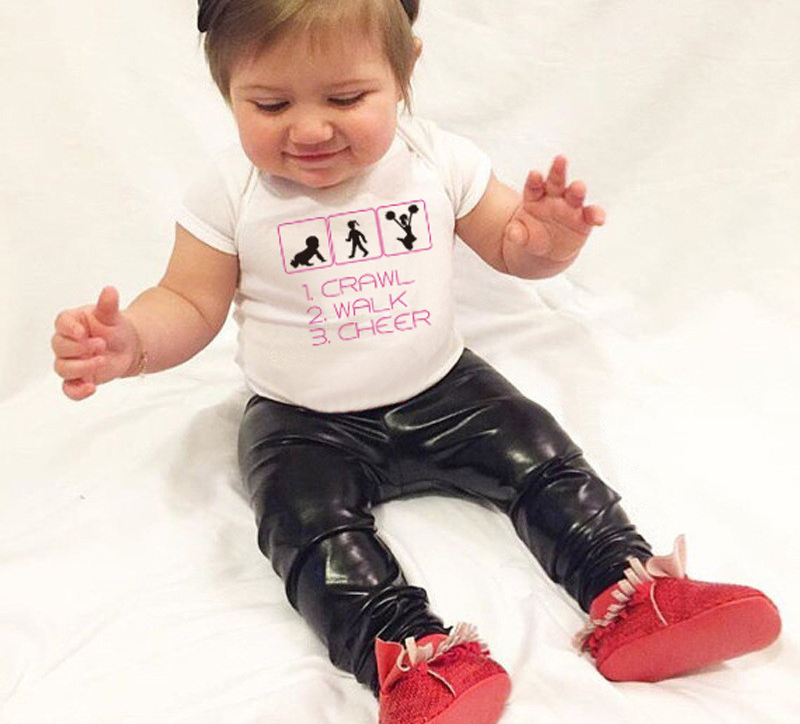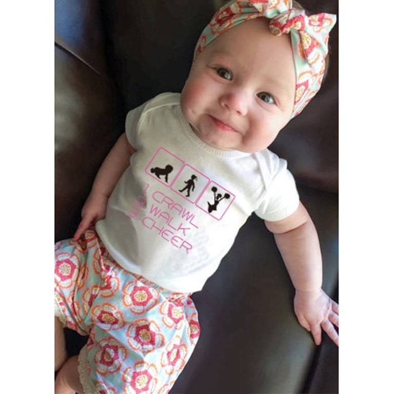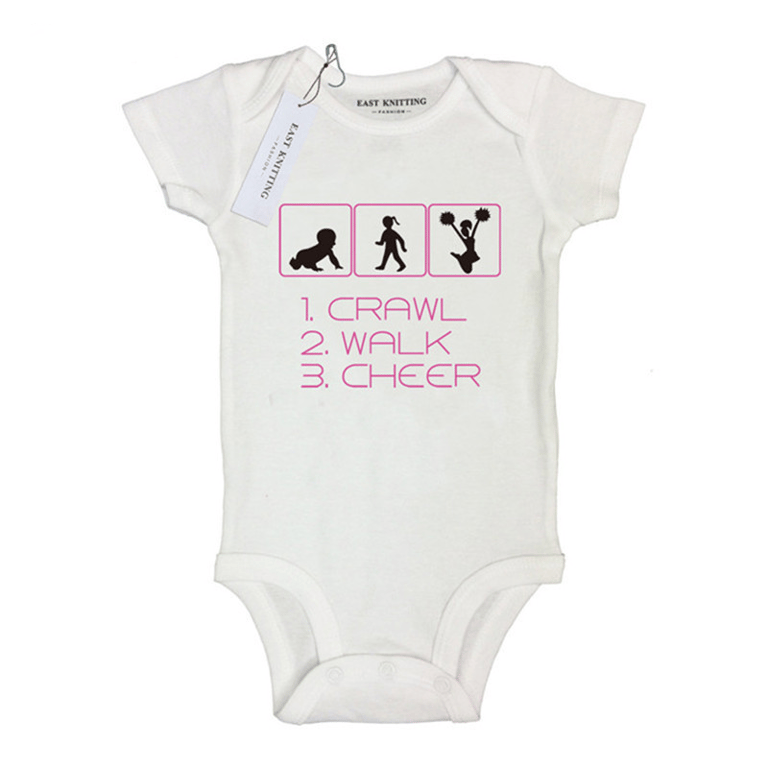 For warm weather, short-sleeved baby bodysuits like the one you see here are ideal. The bodysuit features a cheerleading theme.
