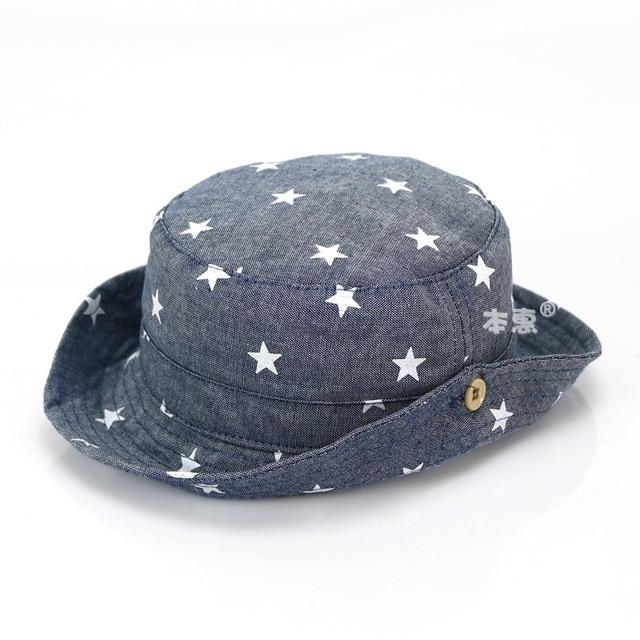 Summer children's hat in dark grey and light blue with stars.