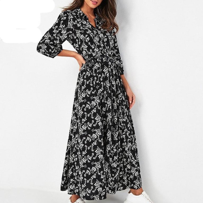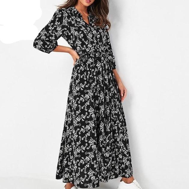 Beautiful long summer chiffon dress with 3/4 sleeves. The dress features a pattern of small flowers.