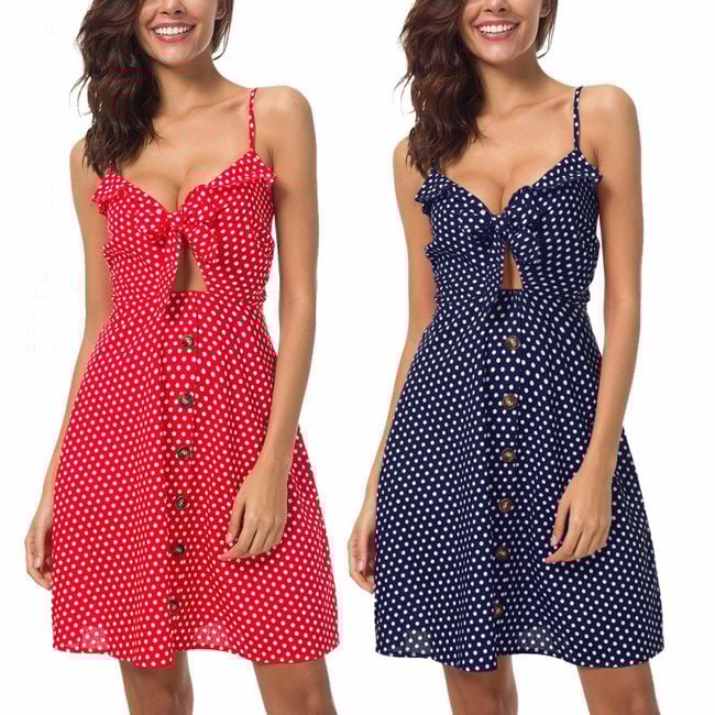 The summer polka dot dress with buttons will be an amazing piece for hot summer days. It features decorative buttons and a bow in the chest area.