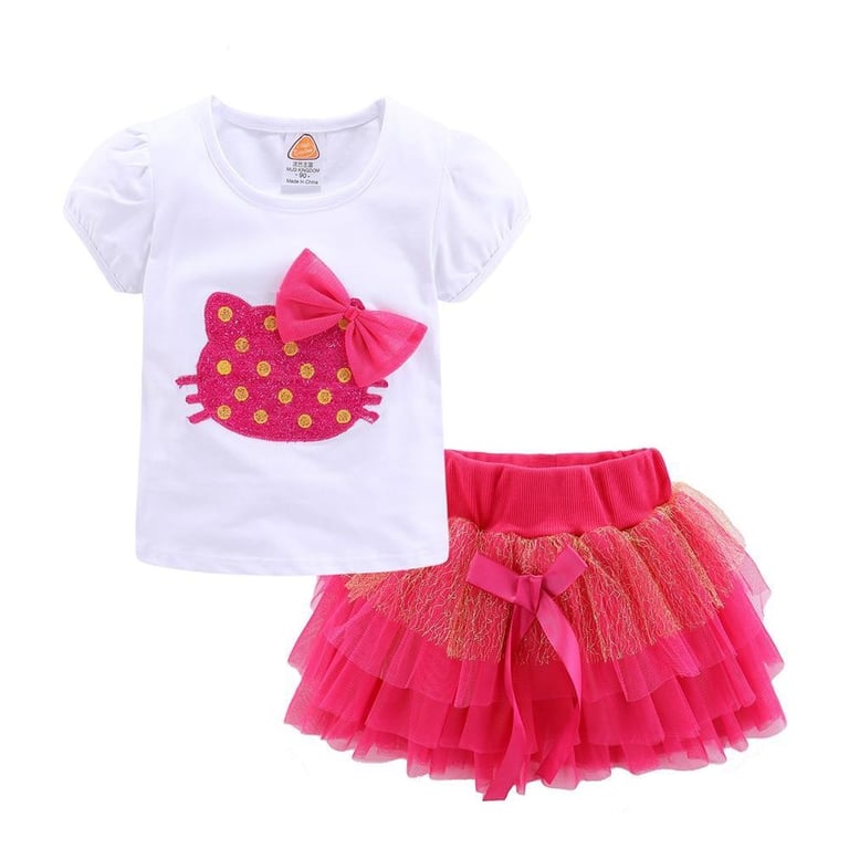 Beautiful summer frill skirt with a t-shirt featuring a cat image. Several colours are available.