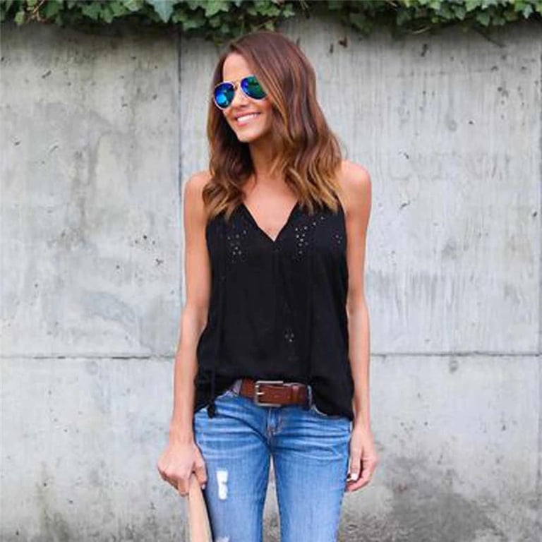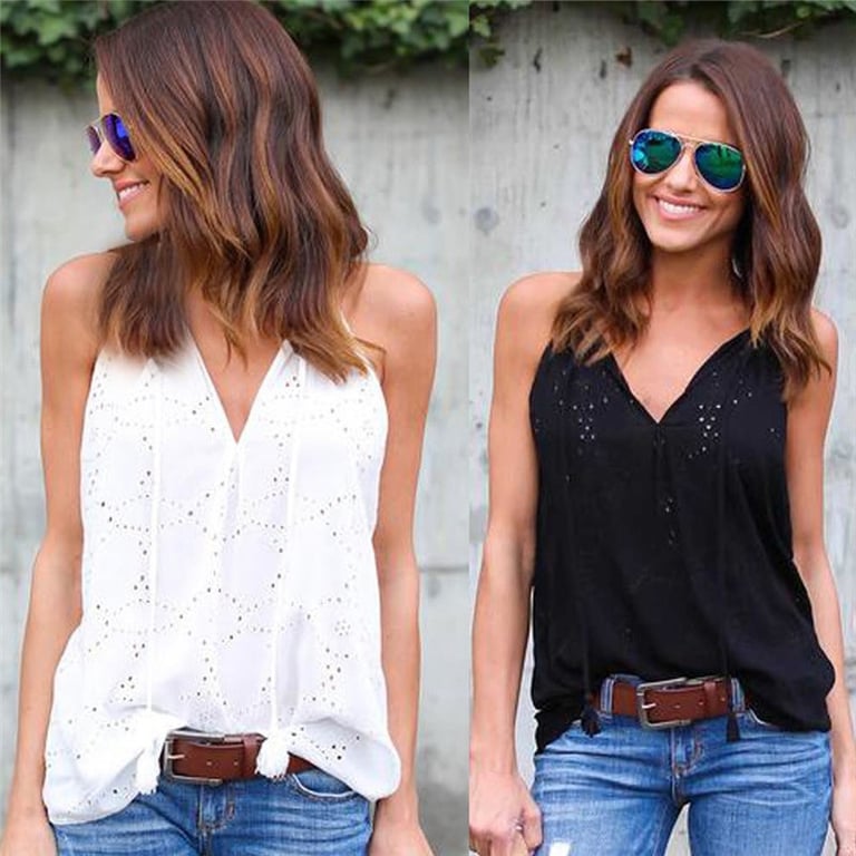 Women's summer sleeveless top with spaghetti straps and a V-neck. Available in black and white.