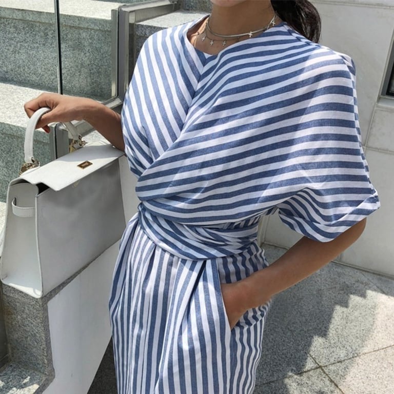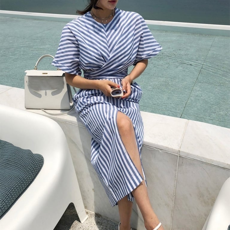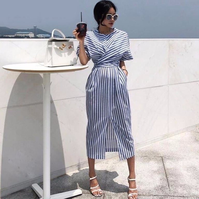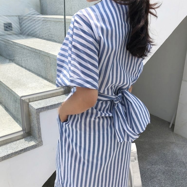 Casual summer dress below the knee. Striped pattern.