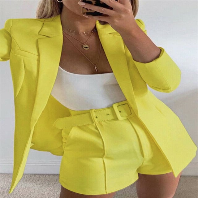 The suit includes a blazer and shorts.