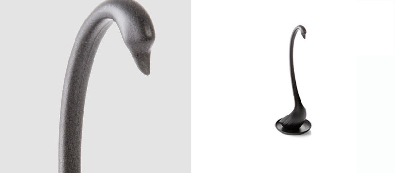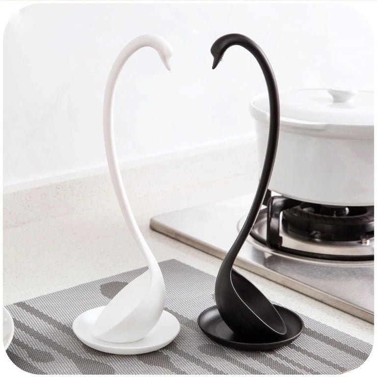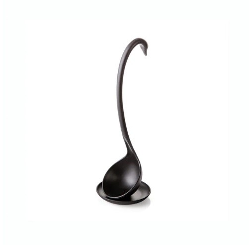 The modern plastic ladle in the shape of a swan is a very practical kitchen tool.