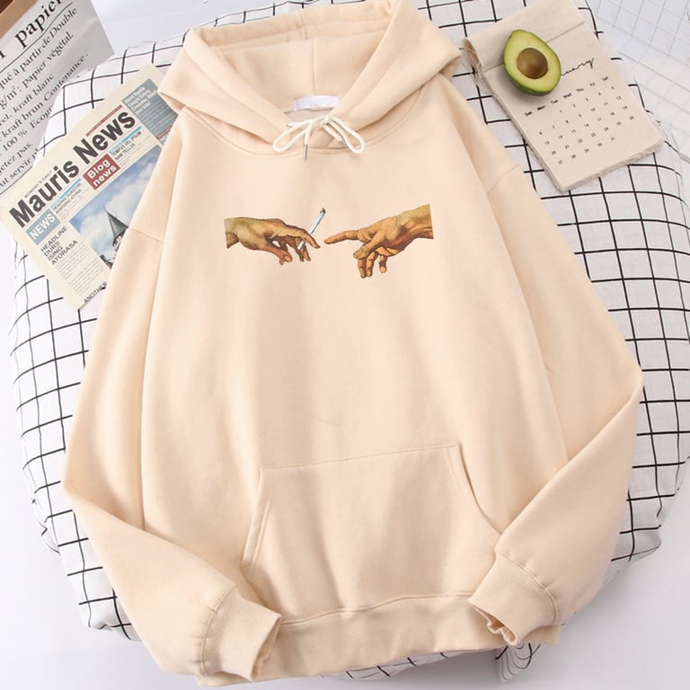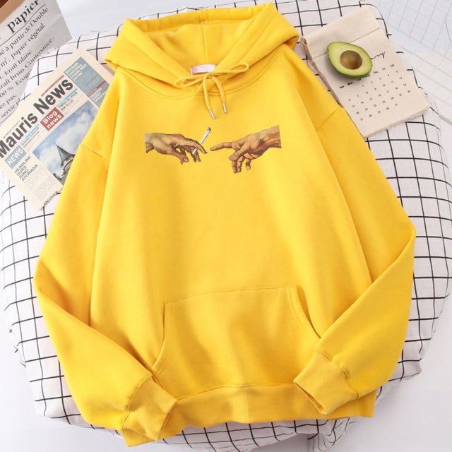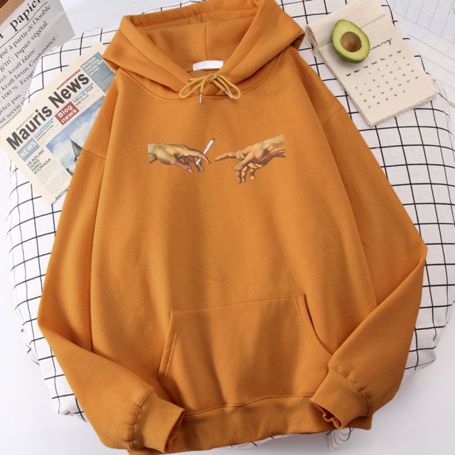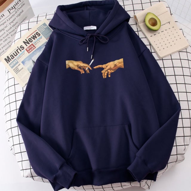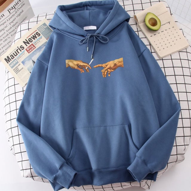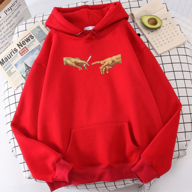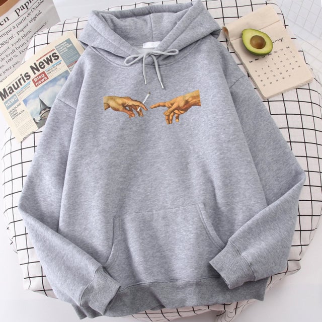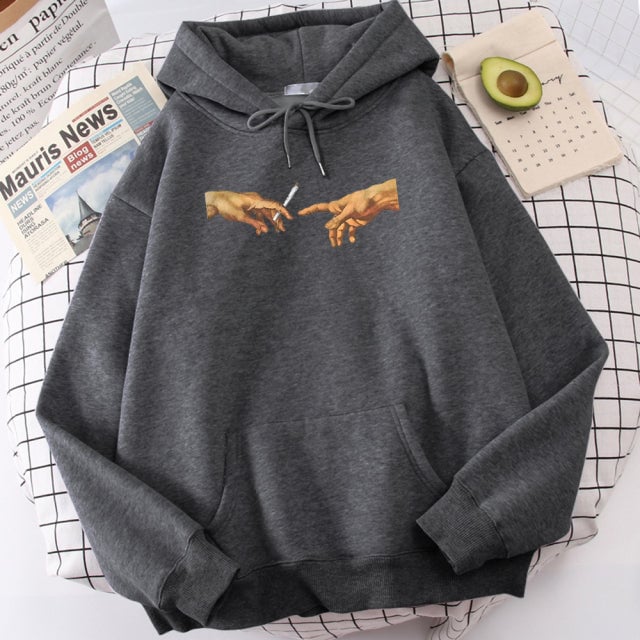 Hooded sweatshirt with a design of a hand handing over a cigarette.