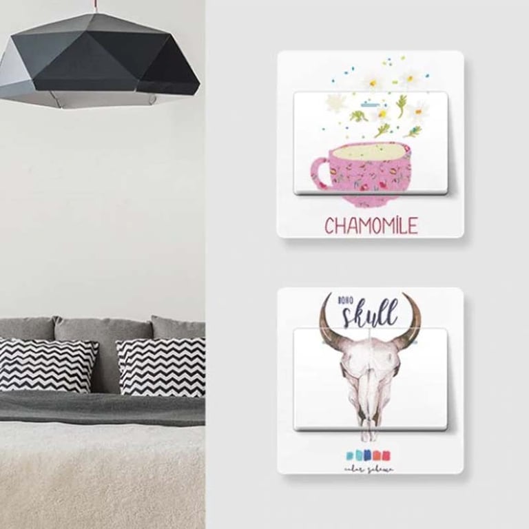 Decorative stickers for light switches. Simply stick the sticker onto the switch and use a narrow knife to cut along the moving parts for a proper fit.