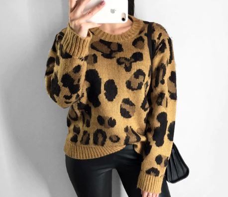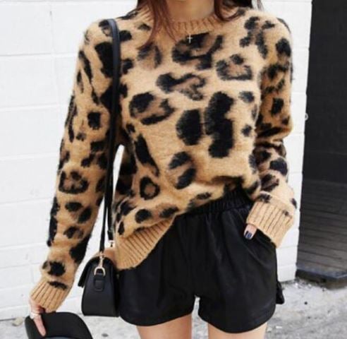Symmetrical shorter leopard print women's sweater with long sleeves