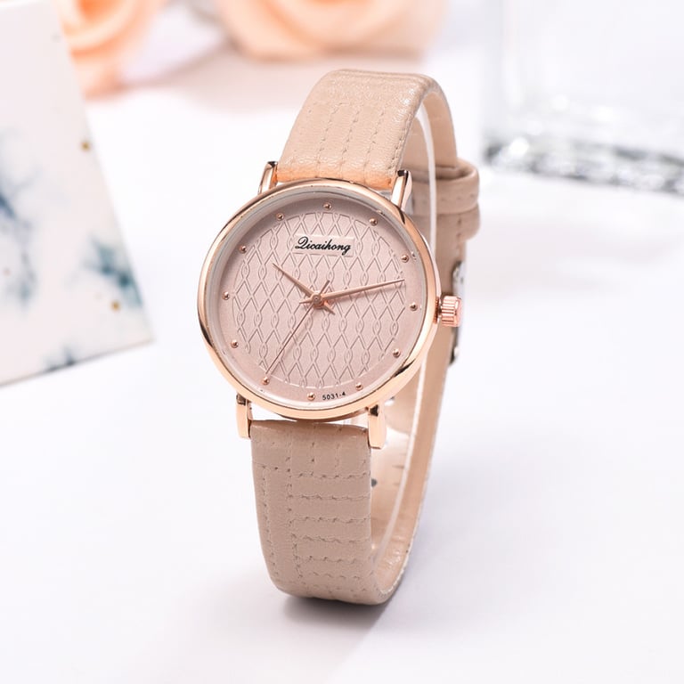 Women's watch with an adjustable faux leather strap. Dial without numbering in a metal frame.