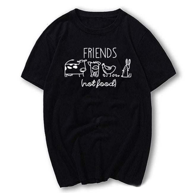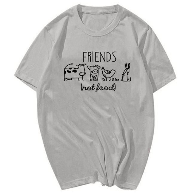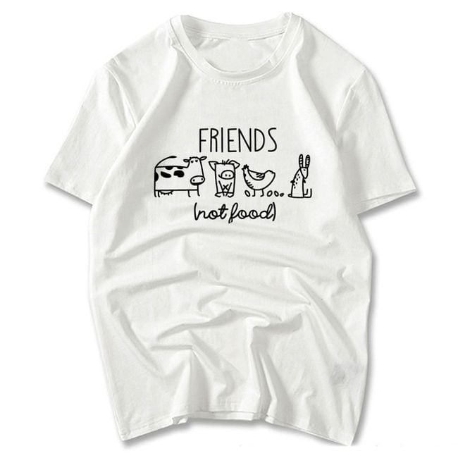 The t-shirt is a solid colour with a print of several animals and the text “(not food)” = not food.