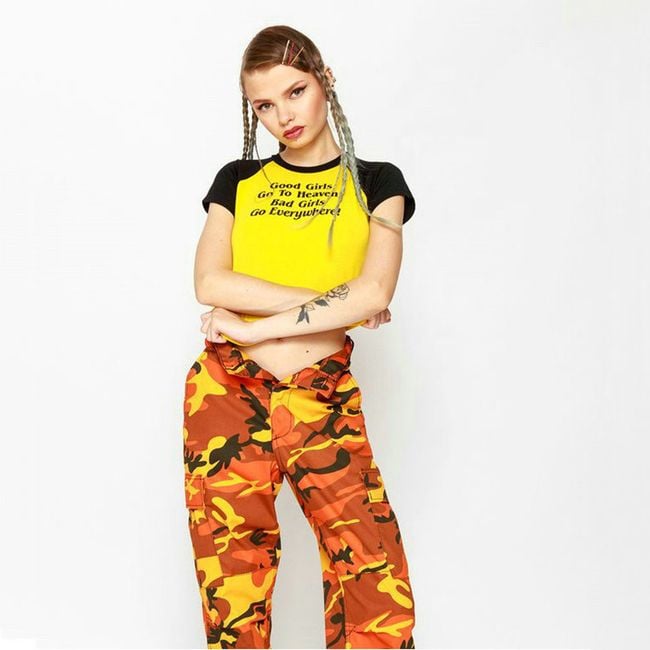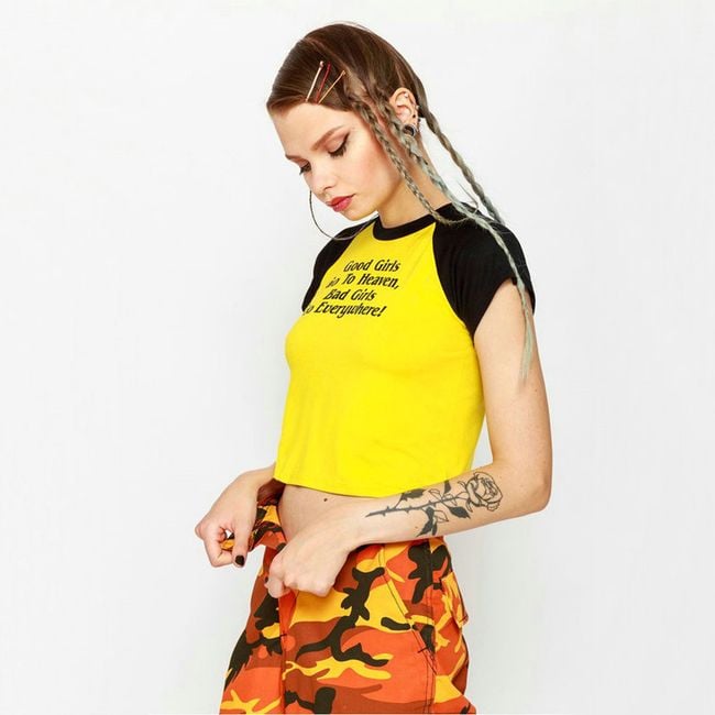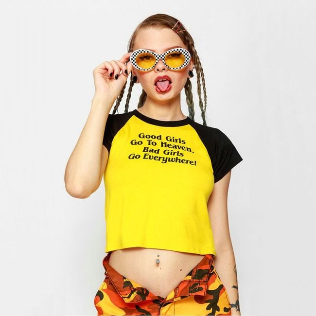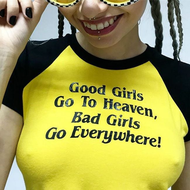 The t-shirt is yellow and black with a black print saying “Good girls go to heaven, bad girls go everywhere.” It is suitable for every young rebellious soul.
