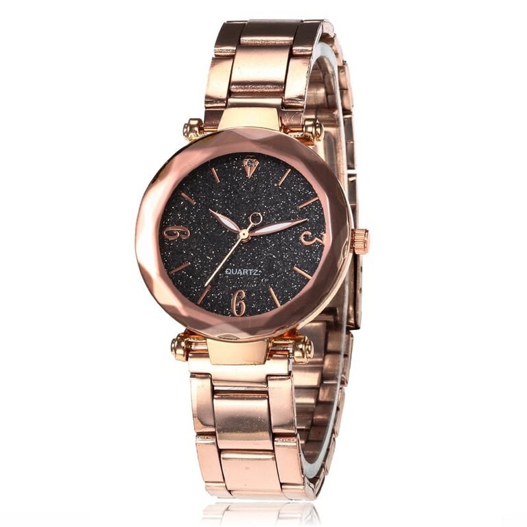 Women's watch with a metal strap. Dial with numbering in a metallic frame with glitter.