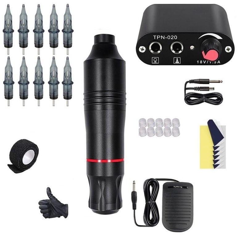 Package Contents: 1x rotary tattoo machine, 1x power supply with cable, 10x tattoo cartridges, 1x pedal, 1x bandage, 2x rubber gloves, 10x ink cups, 5x transfer papers